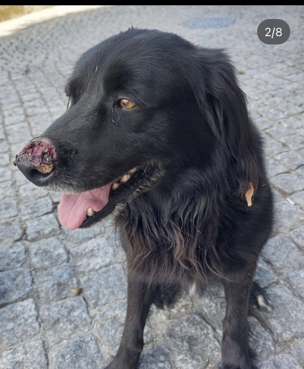 Preguiça o menino resgatado, no Peso da Régua, com o nariz num estado terrível e manco. Viu a vida a sorrir-lhe, por breves instante, até a sua saúde lhe pregar uma rasteira, e ter de ser levado no braços para o consultório veterinário.