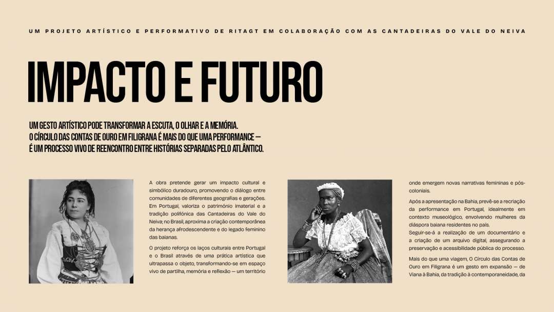 The project "The Circle of Gold Filigree Beads" was born from this dual affiliation: from Rita to the Cantadeiras and from our collective desire to bring the voices of the Neiva Valley into dialogue with the voices of a group of Bahian women from Itaparica Island, Bahia. Together, we will create a performance that unites song, memory, and the symbolism of gold and filigree, activating shared histories between Portugal, Brazil, and Africa.