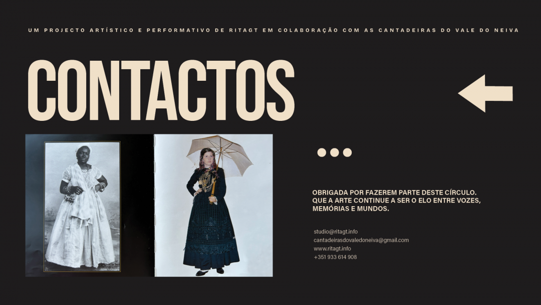 Artist RitaGT , in collaboration with the Cantadeiras do Vale do Neiva Cultural Association , has been selected for an artistic residency at the Sacatar Institute in Bahia (November 2025 – January 2026). It is there that a unique performance will emerge, uniting the polyphonic singing of the Cantadeiras — a living heritage of Minho — with the voices and gestures of a group of Bahian women from Itaparica Island.