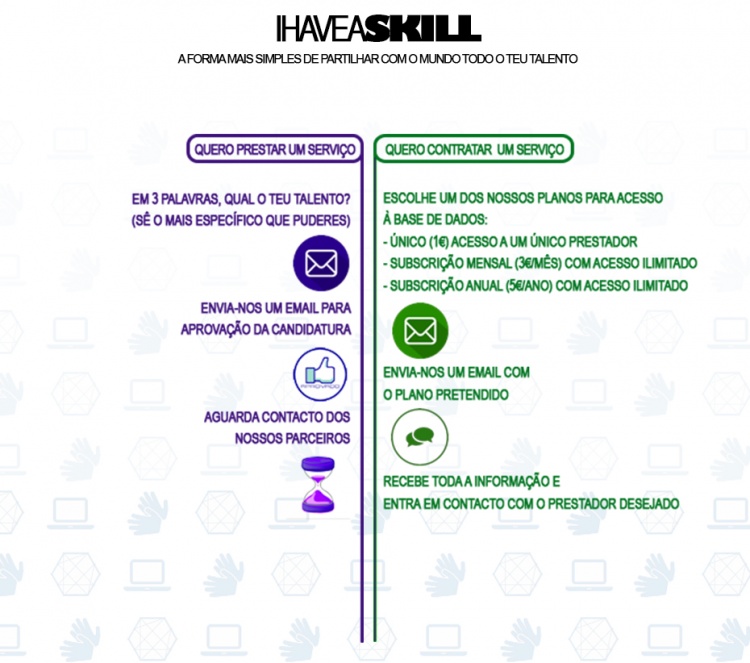 This platform will have, from a starting point, free access by any candidate who wants to spread what they like or would like to do, through an application form that will be approved by I HAVE A SKILL. After approval, the application will be integrated into a category (Arts, Sciences, Technology, Management, Health) and will be visible to the general public. These candidates can be approached by any firm that shows interest in the candidate. To get in touch with candidates, these entities will have 3 types of access plans: (1) single access to a unique candidate; (2) monthly subscription with unlimited access for 1 month; (3) annual subscription with unlimited access for 1 year. These plans will give access to get in contact with the candidate to know more information, to schedule interviews, to contract services.