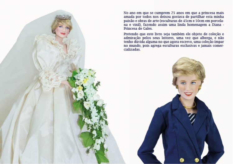 No ano em que se cumprem 25 anos em que a princesa mais amada por todos nos deixou gostava de partilhar esta minha paixão e obras de arte (esculturas de 45 cm e 50 cm em porcelana e vinil), fazendo assim uma linda homenagem a Diana - Princesa de Gales. Pretendo que este livro seja também ele objeto de coleção e admiração pelos seus leitores, uma vez que alberga, e não tenho dúvida alguma no que agora escrevo, uma coleção ímpar no mundo, pois agrega várias esculturas exclusivas e jamais comercializadas. Terá uma impressão a cores, de altíssima qualidade, em papel coché mate e capa dura. No entanto, sem a sua ajuda tornar-se-á praticamente impossível editar este livro. Por isso apelo ao seu bom gosto, à sua própria vontade de homenagear este ser humano único, e de ter na sua biblioteca um exemplar deste livro, também ele único, e assim confiar no seu apoio para a sua edição que será bilingue (portugês/ inglês).